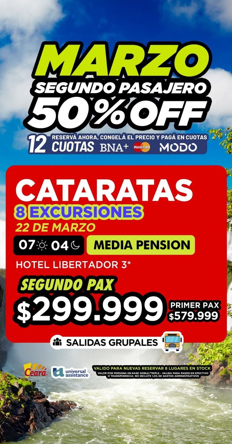 Cataratas: Con 8 excursiones de regalo y media pensión. Salidas: 22/03, 05/04 y 20/04. Desde $539.999.